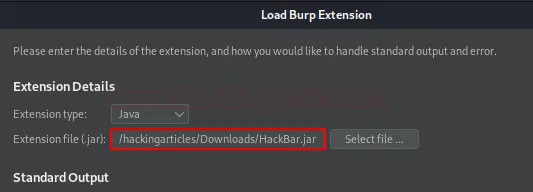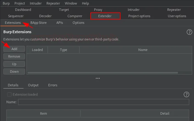 Щойно файл буде завантажено, ми повертаємося до нашого Burp Suite і переходимо до розділу Extensions у вкладці Extender. Там ми натискаємо кнопку Add, щоб відкрити вікно «Load Burp Extension».