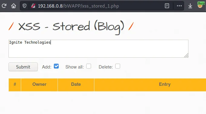 Відкрийте IP-адресу цілі в браузері та увійдіть у bWAPP під обліковими даними bee:bug. Далі встановіть у налаштуванні «Choose Your Bug» опцію «XSS – Stored» і натисніть кнопку hack.