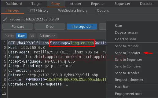 Поверніться в bWAPP, переключіться на вразливість Remote & Local File Inclusion, виберіть «English» із випадаючого списку та натисніть кнопку Go, попередньо увімкнувши перехоплення у Proxy.