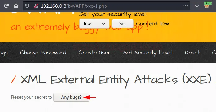 Цього разу перейдіть на вебсторінку XML External Entity Attacks і натисніть кнопку «Any bugs?», попередньо увімкнувши проксі-сервіс (ON).