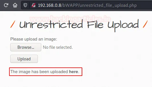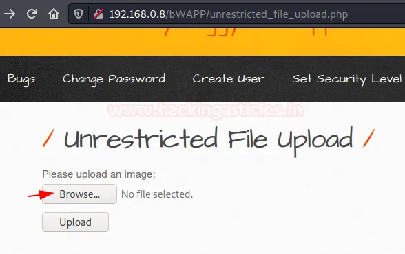 Тепер настав час атакувати вразливість. Поверніться до додатка bWAPP і виберіть пункт Unrestricted File Upload.