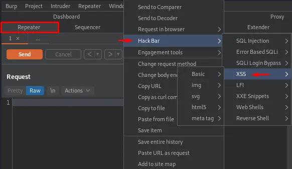 Перейдіть у вкладку Repeater і клацніть правою кнопкою миші в будь-якому місці екрана. У контекстному меню, що з’явиться, ви побачите новий пункт — «Hackbar».