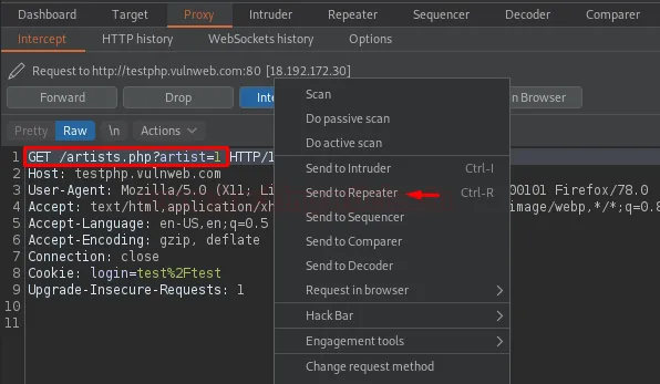 Щойно Proxy почне перехоплювати запит, передайте його в Repeater.