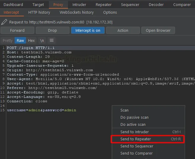 Щоб почати роботу, перехопіть HTTP-запит у вкладці Proxy > Intercept. Натисніть правою кнопкою миші на запит і виберіть «Send to Repeater» (або натисніть Ctrl + R).