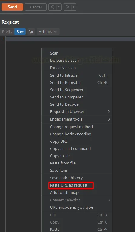 Тепер ми натискаємо правою кнопкою миші на порожню область розділу Request і вибираємо в контекстному меню опцію «Paste URL as request» (Вставити URL як запит).