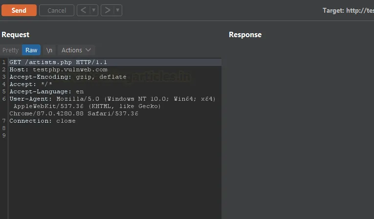 Як видно на зображенні нижче, Burp автоматично перетворив URL-адресу на повноцінний запит, додавши всі необхідні базові заголовки. Це відбувається автоматично. Тепер, коли у нас є готовий запит для URL, який ми хочемо дослідити, ми можемо просто натиснути кнопку Send і проаналізувати отриману відповідь.