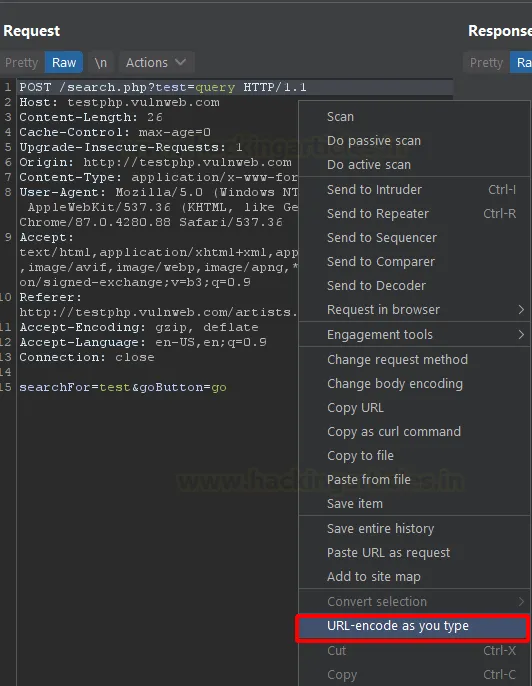Крім того, деякі фільтри безпеки налаштовані на пошук конкретних символів, таких як < >, але їхні еквіваленти у форматі URL Encode можуть не фільтруватися. Це дозволяє обійти захист шляхом простого кодування корисного навантаження (payload). У демонстрації нижче ми натискаємо правою кнопкою миші на запит у Repeater і обираємо опцію «URL-encode as you type». Це дозволить автоматично кодувати наш текст у формат URL Encode безпосередньо під час введення.