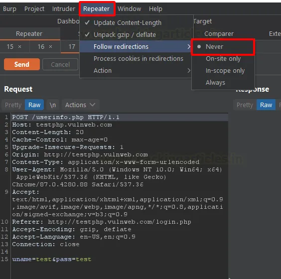 Перенаправлення (редирект) є важливою частиною будь-якого вебдодатка. Воно допомагає користувачеві навігувати сторінками так, як це задумав розробник, а також дозволяє інтегрувати кілька різних вебзастосунків в один сайт. Веббраузери за замовчуванням автоматично слідують перенаправленням, і це створює проблему для пентестера. Під час тестування таких сценаріїв, як Open Redirection (відкритий редирект) або Web Cache Poisoning (отруєння вебкешу), спеціалісту необхідно перехоплювати та аналізувати саме відповідь сервера з кодом перенаправлення.
