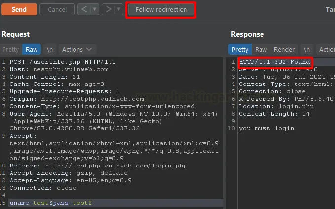 Оскільки на попередньому етапі ми обрали варіант «Never» (Ніколи не слідувати перенаправленням), на зображенні нижче ми бачимо відповідь сервера з кодом 302. Тепер, маючи відповідь із редиректом, ми можемо продовжити роботу із запитом, натиснувши кнопку «Follow redirection», як показано нижче.