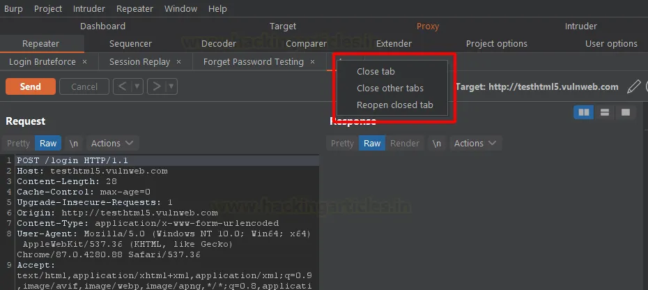 Якщо ви користуєтеся Burp уже певний час, ви напевно хоча б раз випадково закривали вкладку в Repeater, яка вам була потрібна. Ви не самотні, і це не ваша провина. Кнопка закриття (X) розташована так, що на неї дуже легко натиснути помилково. Після численних запитів користувачів компанія PortSwigger додала функцію для розв’язання цієї проблеми. Тепер ви можете натиснути правою кнопкою миші на область вкладок і вибрати опцію «Reopen Closed Tab», щоб відновити будь-яку вкладку, закриту помилково.