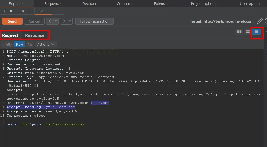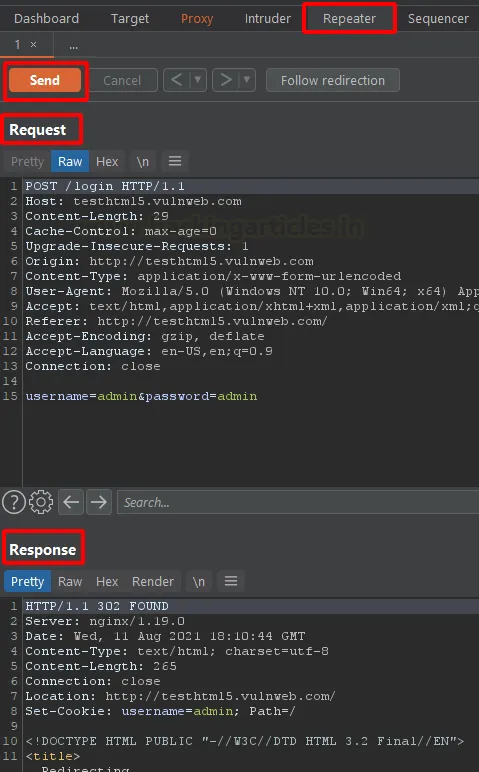 Тепер у вкладці Repeater ми можемо маніпулювати запитом. Після натискання кнопки Send запит буде надіслано цілі, а відповідь відобразиться у правій секції Response.