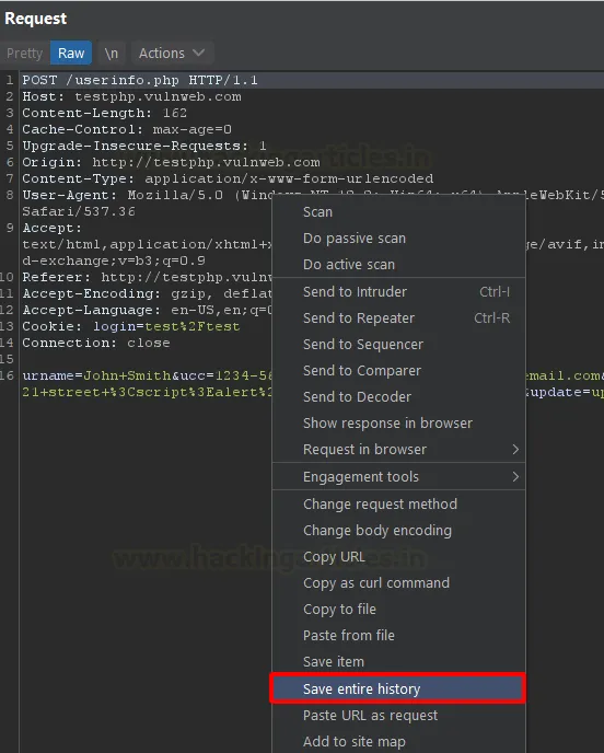 Як відомо, документування є життєво важливою частиною будь-якого проекту з тестування. Коли ми надсилаємо численні запити в Repeater, ми часто вносимо зміни в кожен із них. Для того, щоб відстежувати ці зміни за межами Burp Suite, існує функція збереження історії всіх запитів. Після завершення роботи з декількома запитами просто натисніть правою кнопкою миші на будь-який запит і виберіть опцію «Save entire history» (Зберегти всю історію) у випадаючому меню.