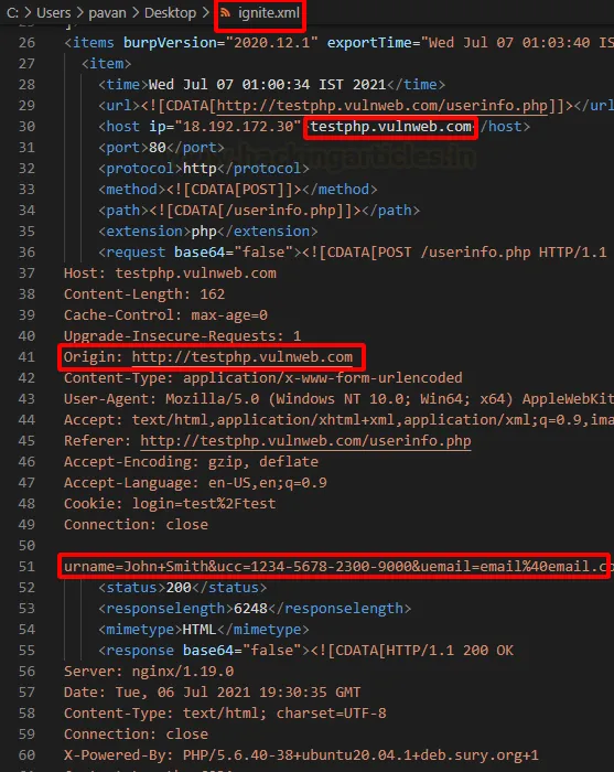 Збережена історія буде зберігатися у вибраному місці у форматі XML. Як видно на зображенні нижче, файл містить такі деталі, як IP-адреса цілі, домен, порт, протокол, а також повний вміст як запиту, так і відповіді.