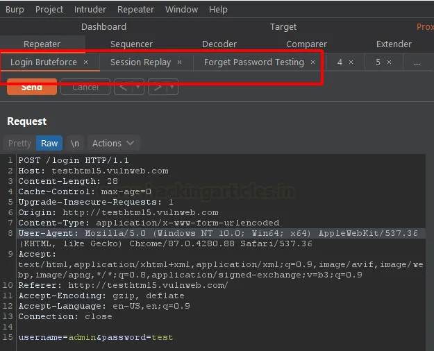 Двічі клацніть на назву вкладки, щоб перейменувати її. Використовуйте назви, що відповідають типу тестування (наприклад, “SQLi Test”, “Admin Bypass” тощо), щоб легко орієнтуватися в сесії.