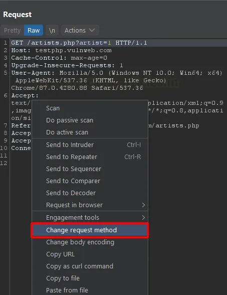 Repeater дозволяє миттєво змінювати HTTP-методи (GET, POST, PUT, OPTIONS тощо). Наприклад, якщо сторінка з формою приймає дані через GET, але ви хочете протестувати їх передачу через POST — просто виберіть у контекстному меню «Change request method».