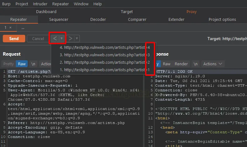 Repeater має кнопки «Назад» (<) та «Вперед» (>). Це надзвичайно корисно, якщо ви тестуєте різні параметри й хочете повернутися до попередньої ітерації запиту, яка працювала коректно. Ви можете переглянути всю історію змін у вкладці, натиснувши на стрілку поруч із кнопкою «Назад».