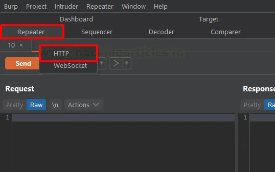 Тепер ми переходимо в Repeater і створюємо нову вкладку, натиснувши правою кнопкою миші на відповідній панелі. З’явиться запит про тип нової вкладки: HTTP-запит чи WebSocket-запит. Оскільки ми працюємо з вебсторінкою, обираємо HTTP.